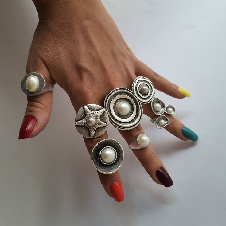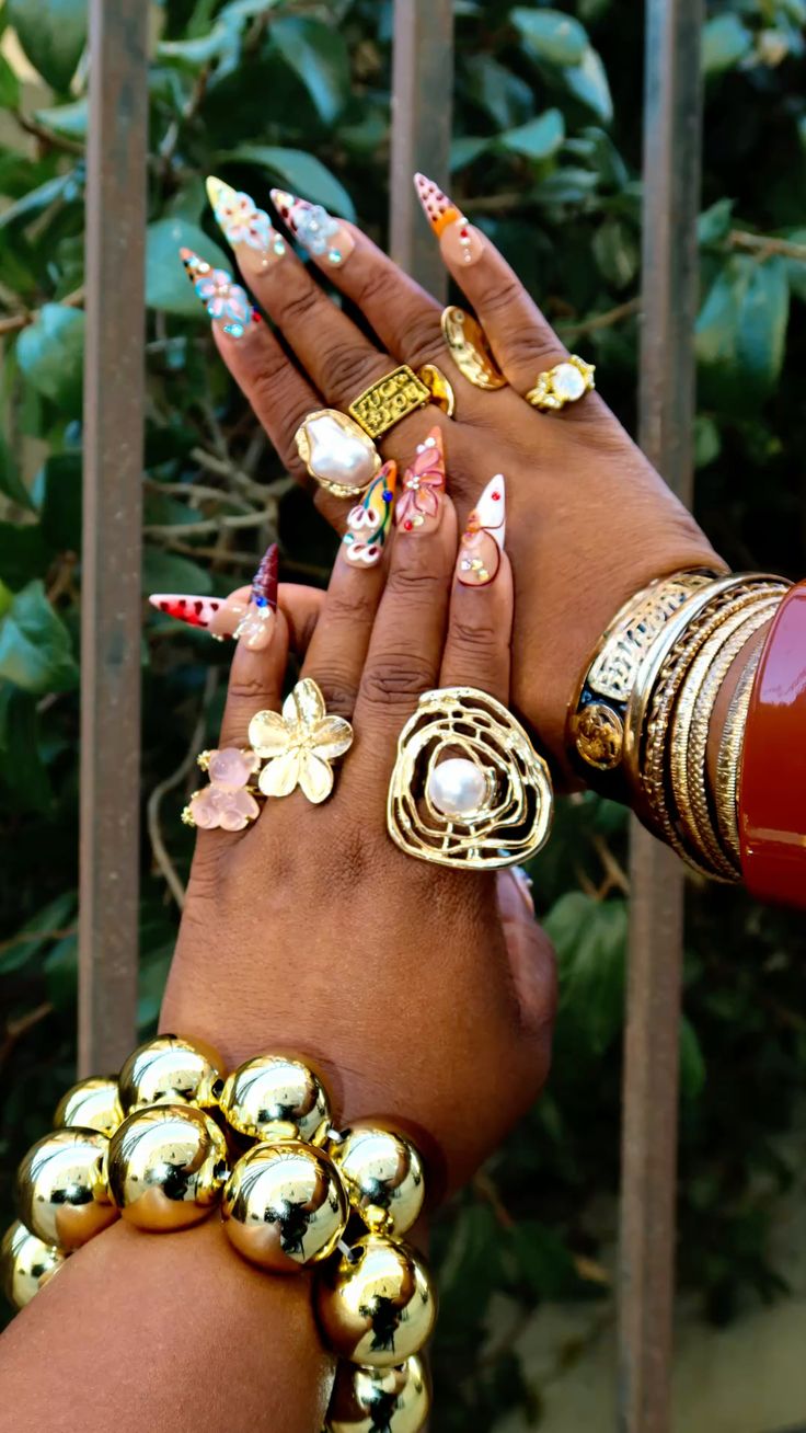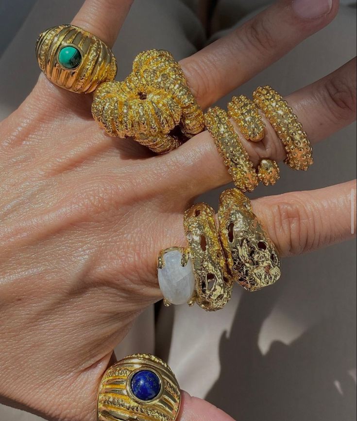 Massives, serties de pierres colorées ou ornées de détails fantaisie, elles captent la lumière et attirent l’œil. L’accumulation reste la règle : plus il y en a, mieux c’est.