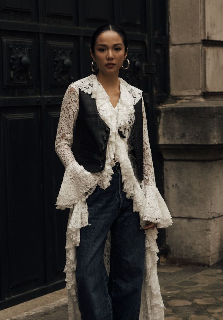 - Dentelle + tailoring : parfait pour le bureau ou un dîner pro.
