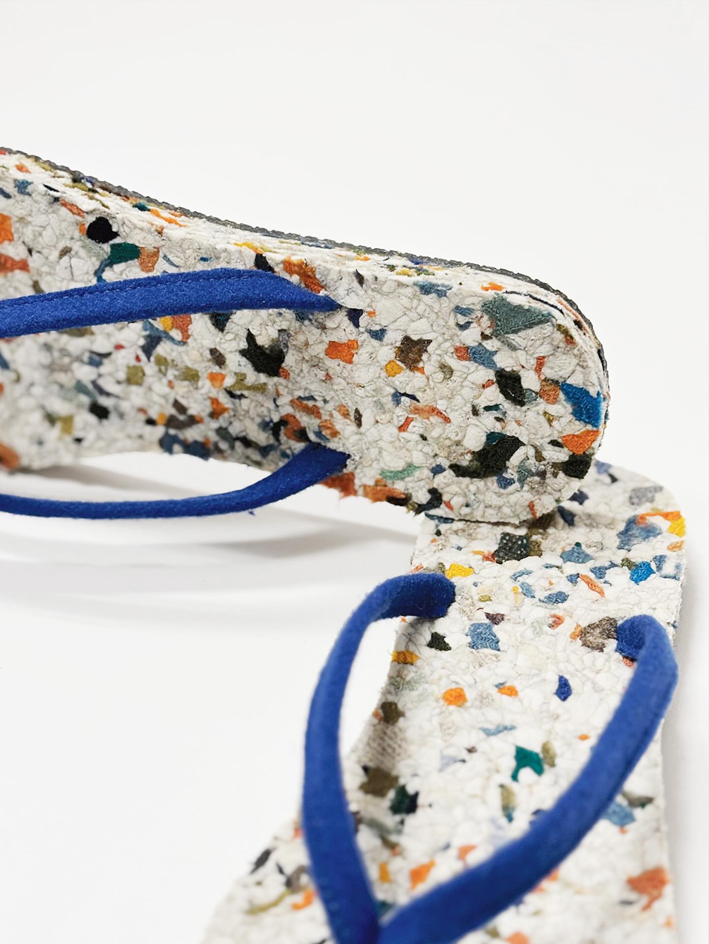 La marque a utilisé ses chutes de chute de burel (laine locale) et le caoutchouc usagé pour fabriquer ses toutes premières Reloved Flip Flops. Deux matières naturelles et solides — un mix parfait entre confort et durabilité. « From trash to wonder », comme le dit si bien Burel.
