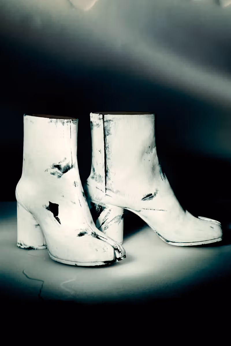 La campagne automne-hiver 2025, dévoilée par Glenn Martens, expose Miley en portraits oniriques signés Paolo Roversi. On la découvre nue, corps recouvert de peinture blanche — clin d’œil direct à la « bianchetto technique » chère à Margiela — portant uniquement les célèbres Tabi boots peintes, le tout dans une esthétique épurée et poétique.