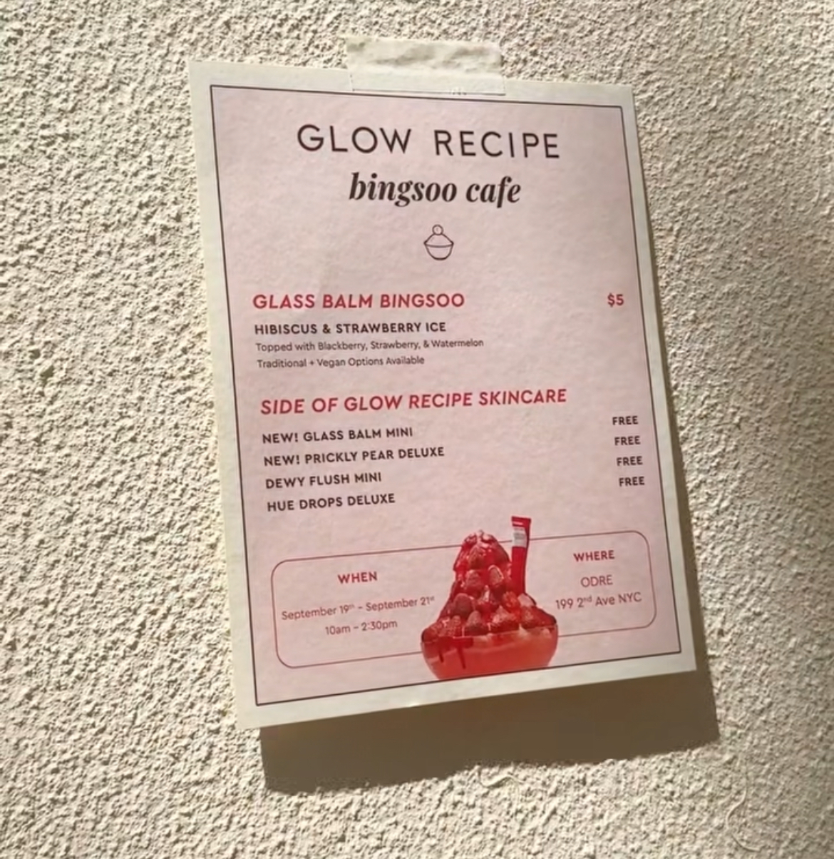 Le concept du Bingsoo Café est directement inspiré du fameux dessert coréen : une glace râpée ultra légère, servie avec des toppings colorés. Le lieu proposera des déclinaisons exclusives aux couleurs des produits Glow Recipe, transformant chaque dégustation en expérience beauté-comestible. Imaginez : siroter un latte givré tout en testant les dernières nouveautés skincare — le genre de croisement inattendu qui incarne parfaitement l’ADN de la marque.