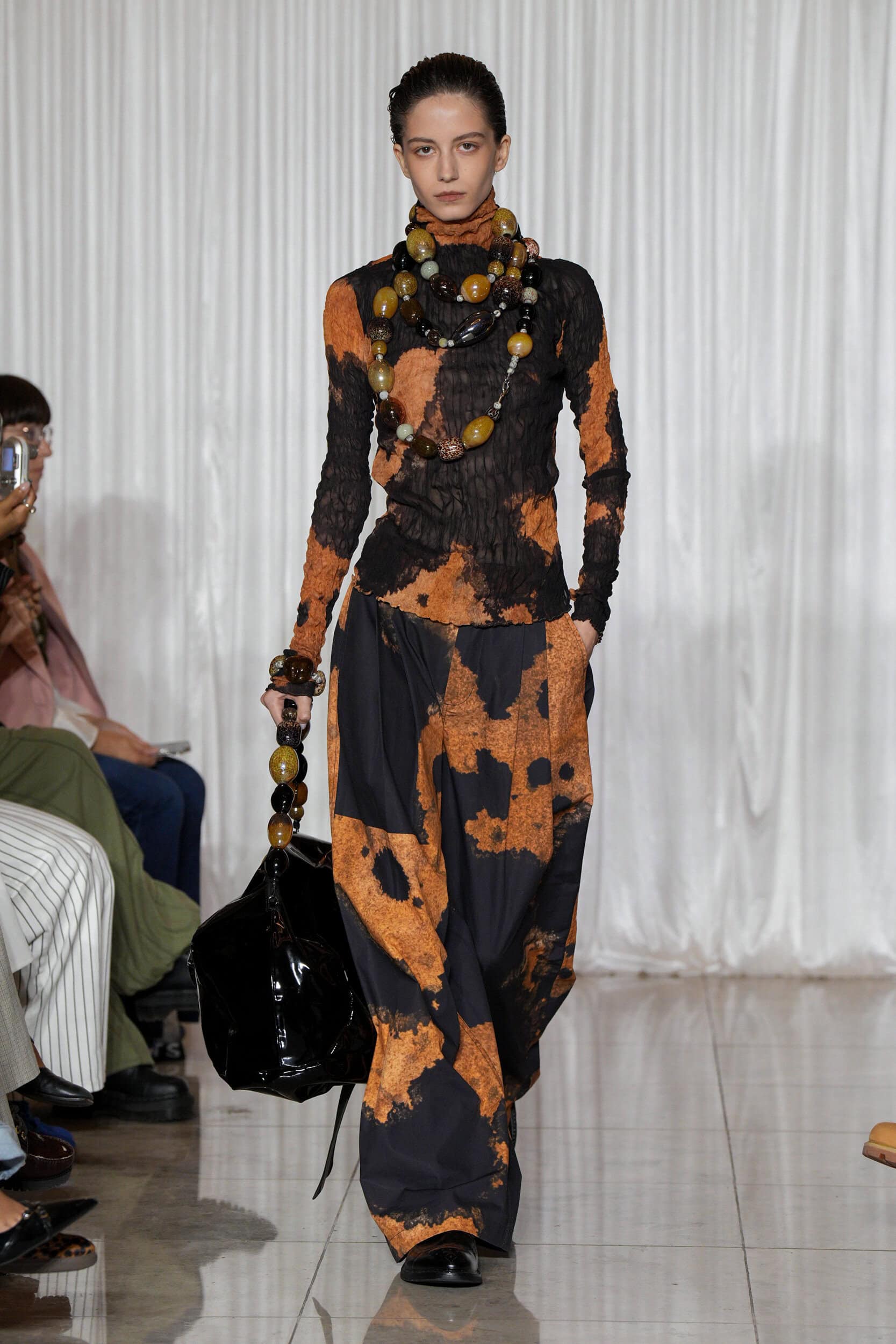 Chopova Lowena (une de mes marques préférés ever) a poursuivi son exploration d’un imaginaire hybride, entre folklore et fantastique : plissés, perles et motifs décalés composaient une collection vibrante, presque onirique.