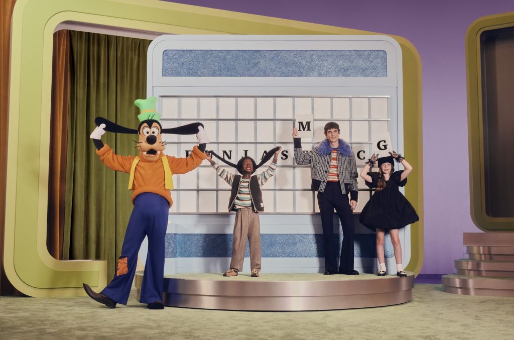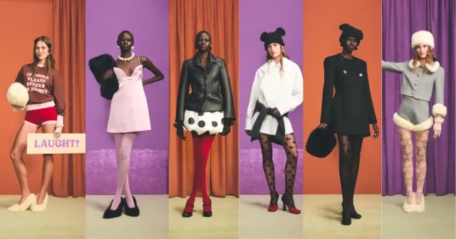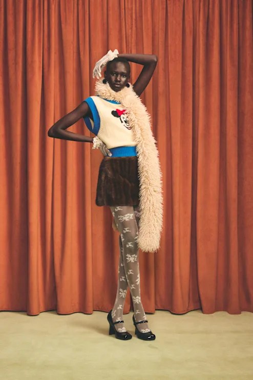 Côté silhouettes, Lambert propose une esthétique à la fois ludique et structurée : jupes à volants, vestes sculptées, pull-overs oversize, T-shirts graphiques et accessoires iconiques comme des bonnets « oreilles de souris ». Les textures jouent aussi un rôle central : fausses fourrures, laines, popelines revisitées.