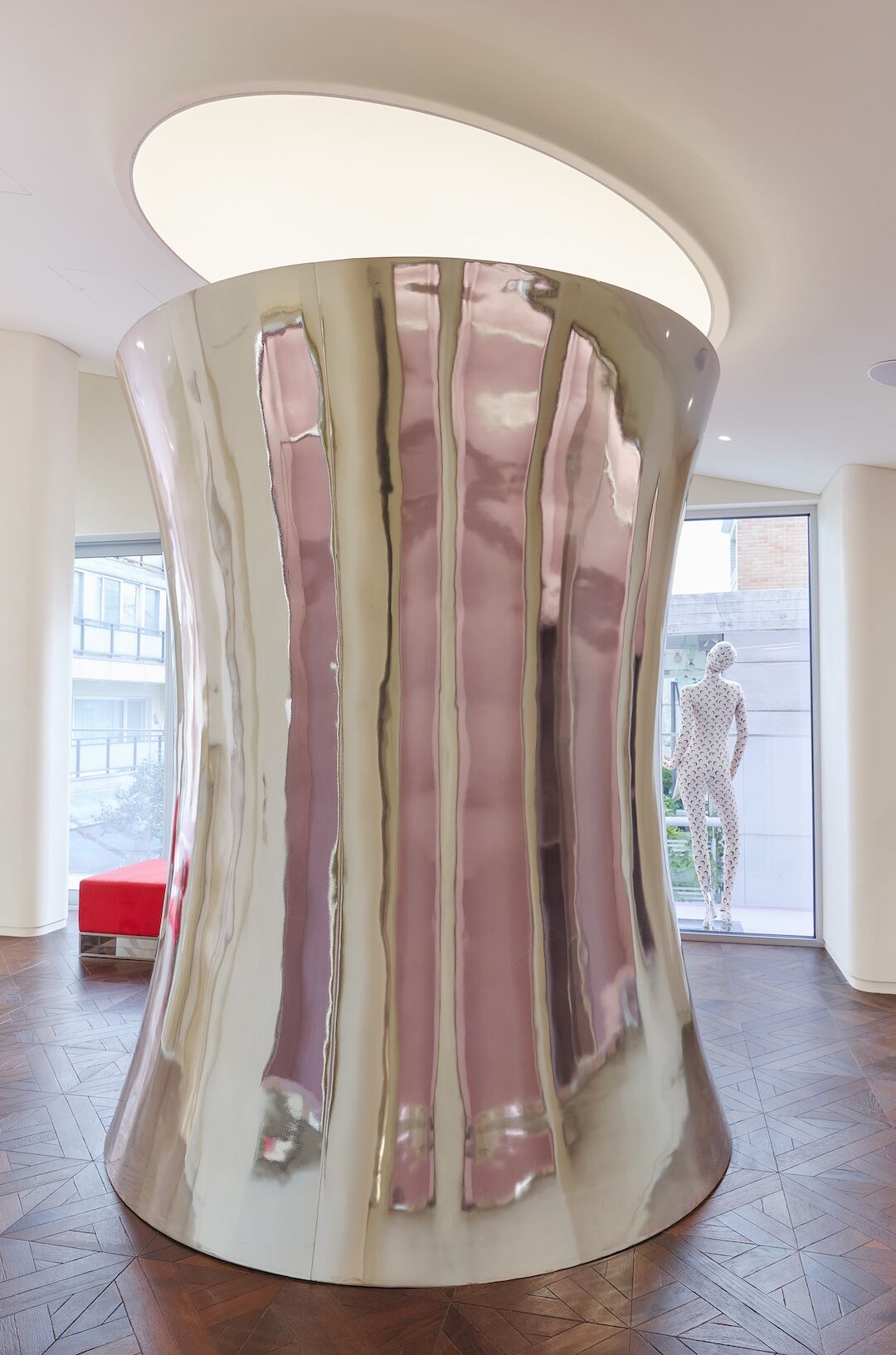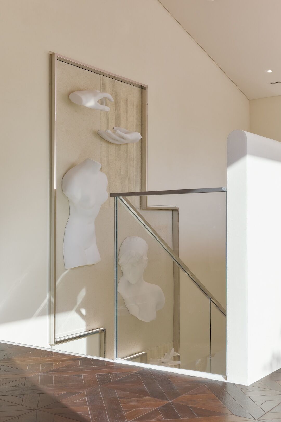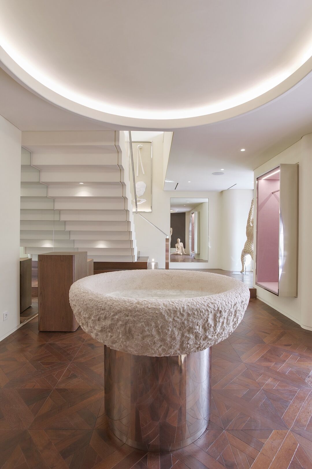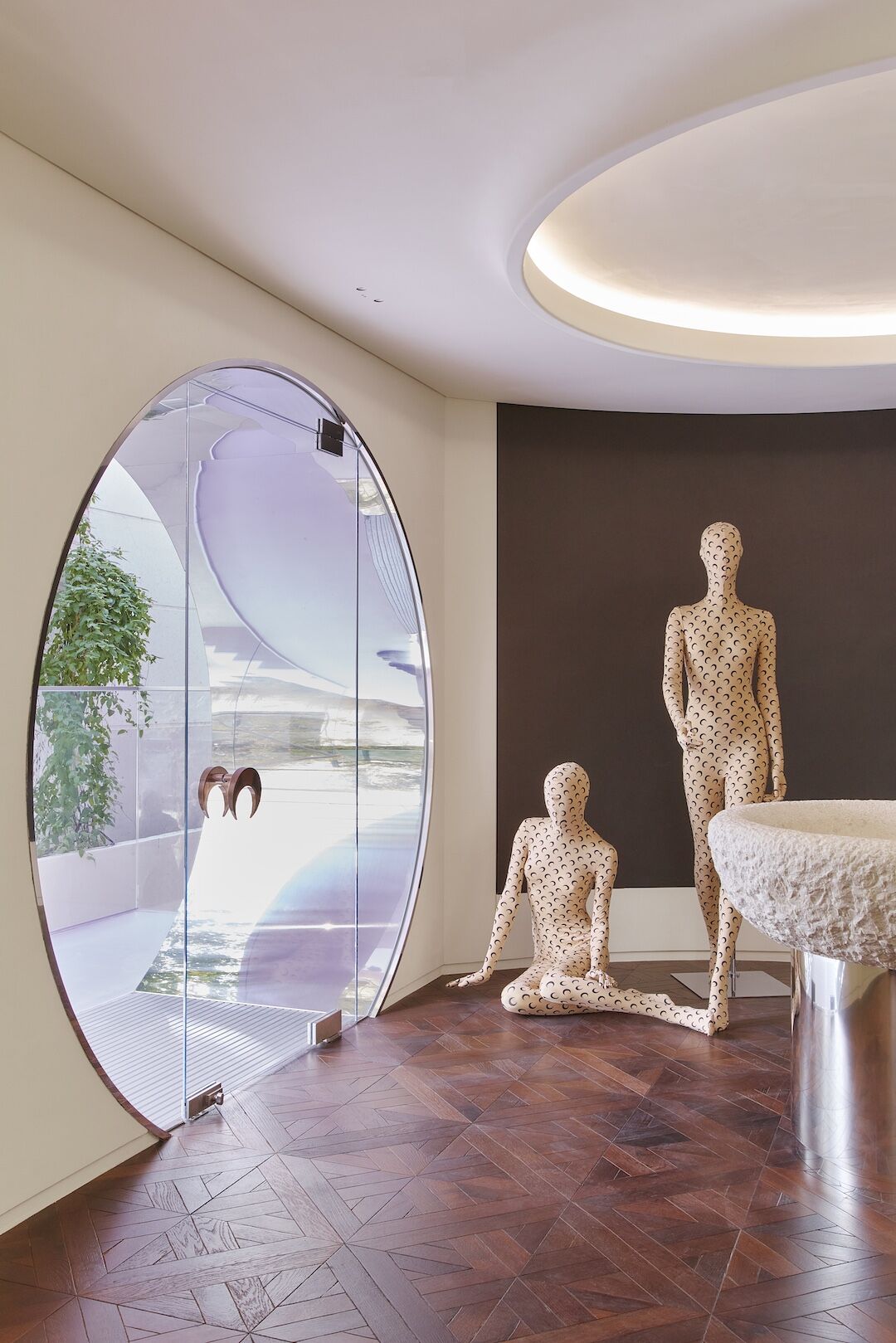 C’est précisément cette dualité qui se matérialise dans Marine Serre Hannam House, imaginée en collaboration avec le studio d’architecture londonien Sybarite, déjà reconnu pour son travail sur des espaces immersifs à forte identité sensorielle. Ensemble, ils ont conçu un lieu pensé comme une expérience initiatique, articulée autour du cycle lunaire – emblème de la marque – et déclinée en quatre séquences : initiation, anticipation, transformation et renaissance. Ce parcours symbolique accompagne la cliente dans un véritable voyage introspectif, du monde extérieur vers un univers intérieur où chaque détail raconte l’ADN de Marine Serre.