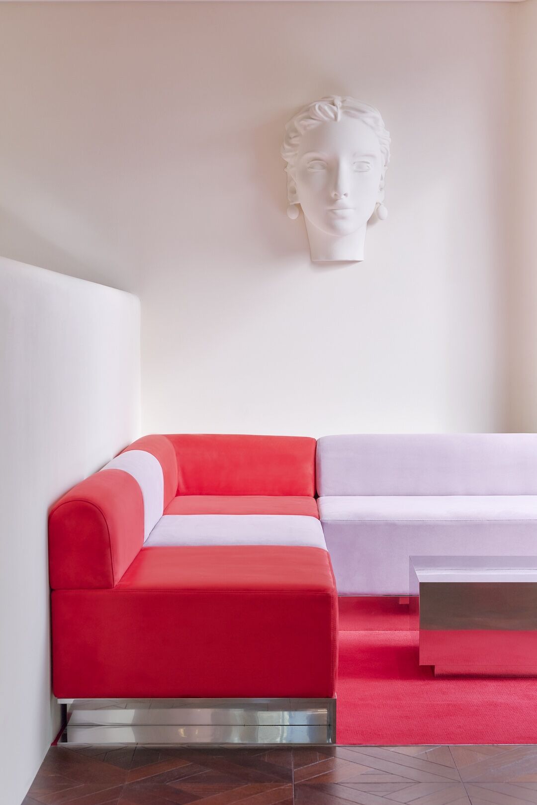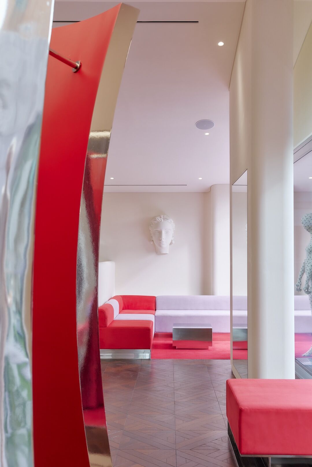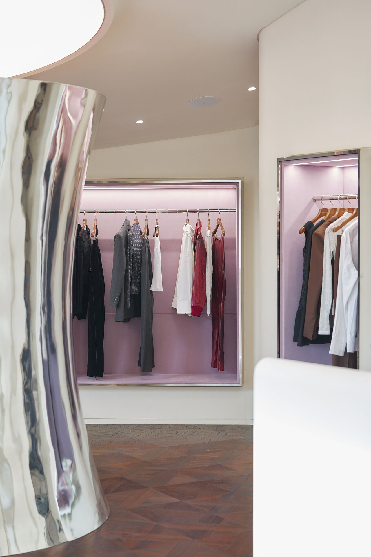 Le lieu s’étend sur deux niveaux et inclut plusieurs zones d’exposition et d’intimité : un espace principal aux volumes sculpturaux, des cabines d’essayage pensées comme des cocons rouges protecteurs, et surtout, des terrasses extérieures verdoyantes qui prolongent la boutique au-delà de ses murs. Des chemins de pierre serpentent entre les plantes, rappelant les paysages lunaires ou les jardins japonais. Cette ouverture sur l’extérieur traduit la volonté de la créatrice d’ancrer la mode dans un dialogue permanent avec la nature.