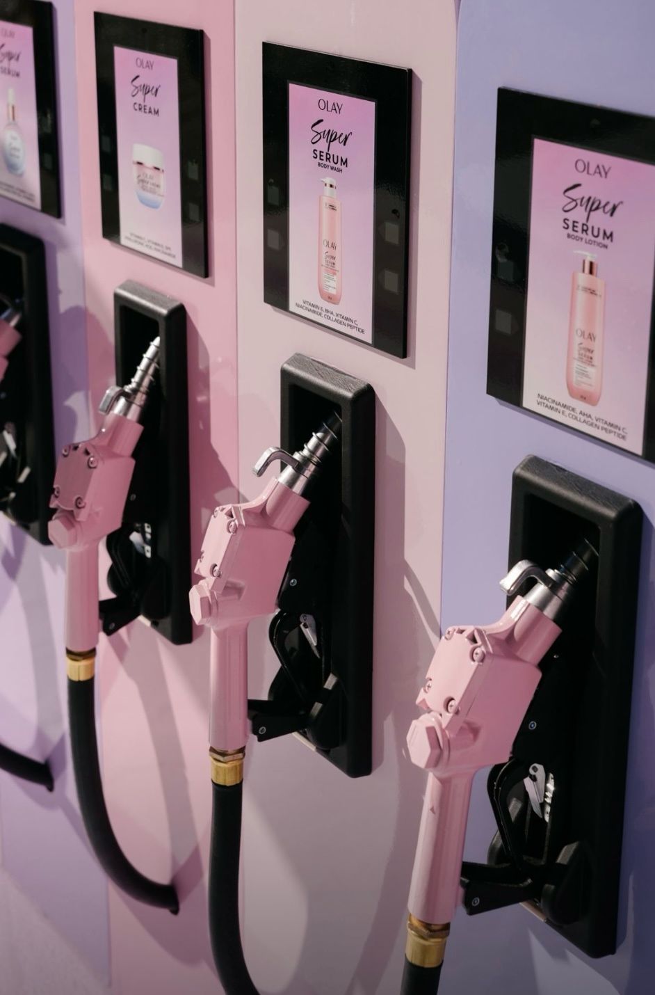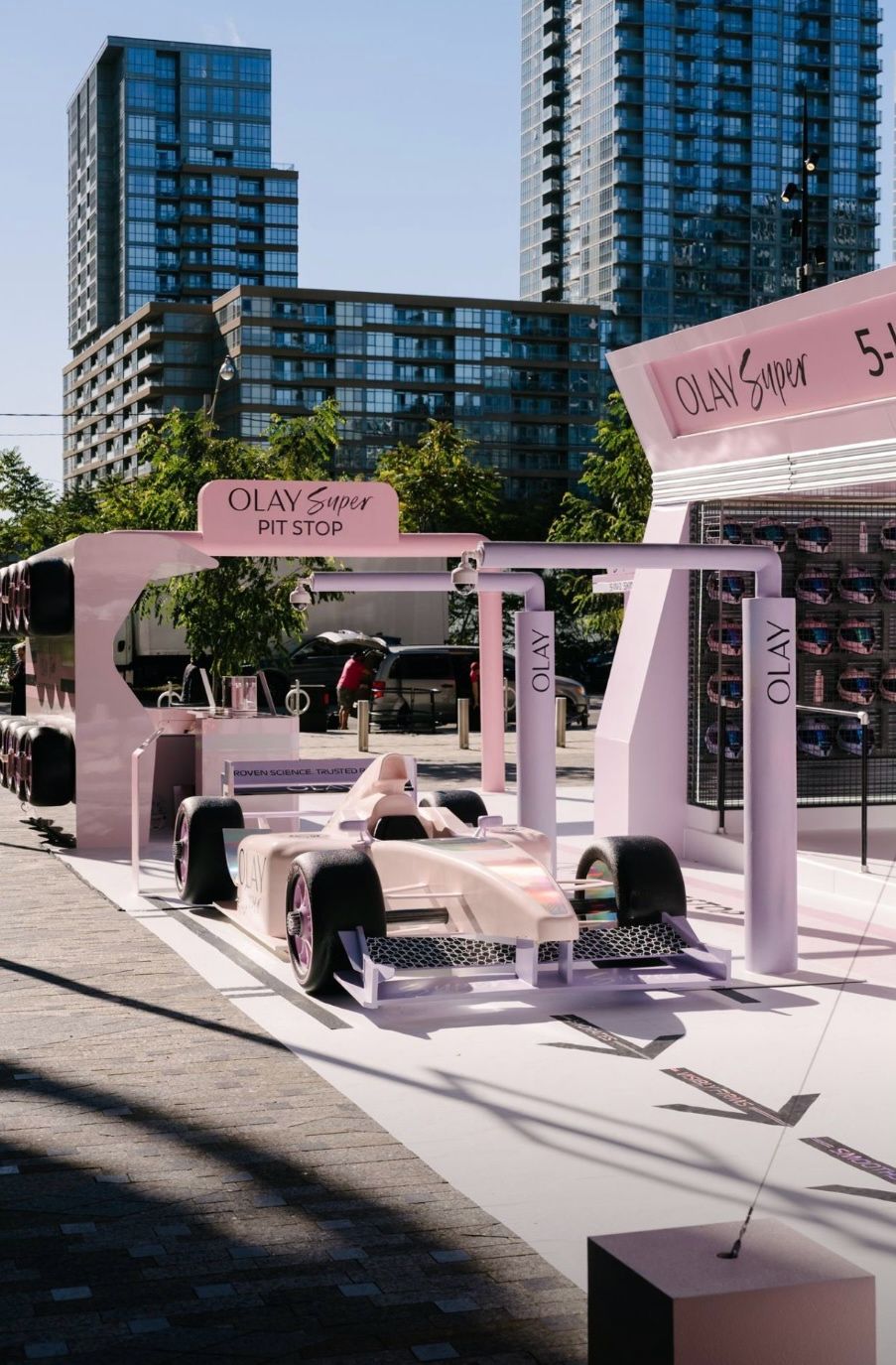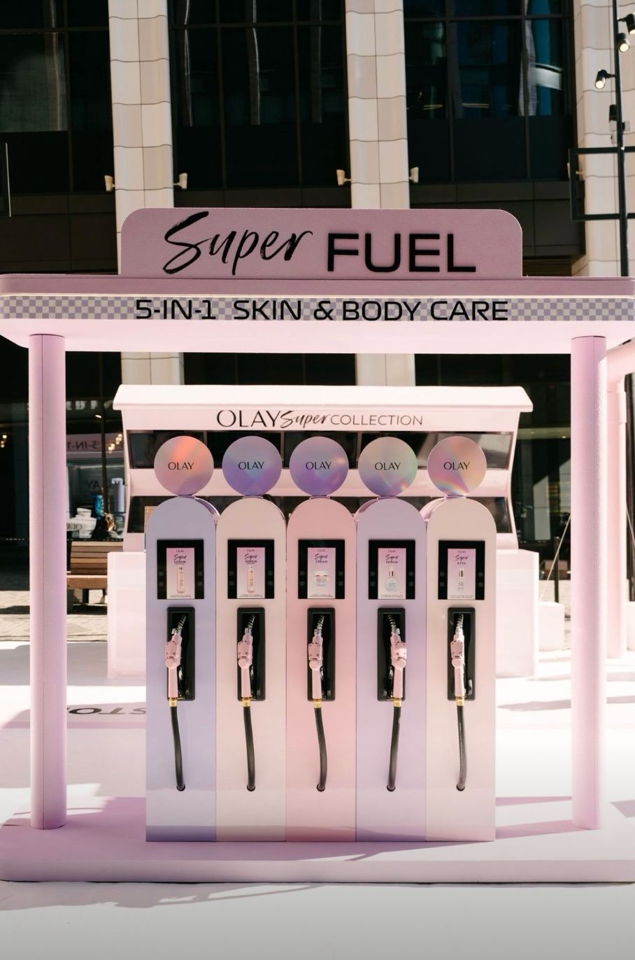 On entre dans le pop-up comme dans un paddock futuriste. Des “super fuel pumps” interactives permettent de découvrir les ingrédients clés de la gamme, un bolide OLAY construit sur-mesure trône au centre de l’espace, les zones de test offrent l’occasion de toucher, sentir, comparer les textures, et un circuit de course compétitif pousse les visiteurs à se challenger façon Grand Prix. C’est fun, c’est immersif, c’est addictif — et surtout, c’est une manière brillante de réinventer l’expérience beauté.