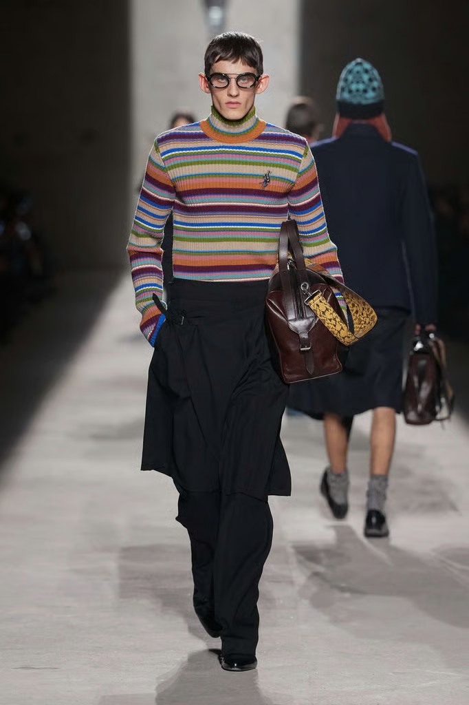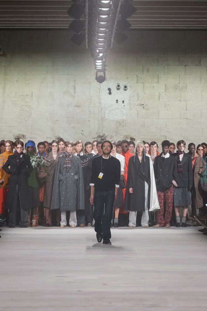 Et puis il y avait Dries Van Noten, qui a offert sa propre lecture de la saison avec une collection aussi raffinée qu’intelligente. Fidèle à son approche artisanale, Van Noten a exploré une palette riche de textures et de motifs, où les teintes terreuses : ambre, olives profondes, nuances de cuir patiné etc, se mêlaient à des touches plus lumineuses. Les silhouettes, à la fois structurées et fluides, semblaient capturer un équilibre délicat entre tradition textile et sensibilité contemporaine. Ce que l’on retient particulièrement, ce sont ces associations inattendues de matières superposées qui donnent l’impression d’un vestiaire en mouvement, presque vivant, et qui traduit cette idée que le vêtement est tant une question de forme que de rythme. Sa collection ne criait pas, mais elle parlait fort : d’attention au corps, d’intemporalité et d’un style qui se façonne au fil des saisons plutôt qu’au gré des tendances.