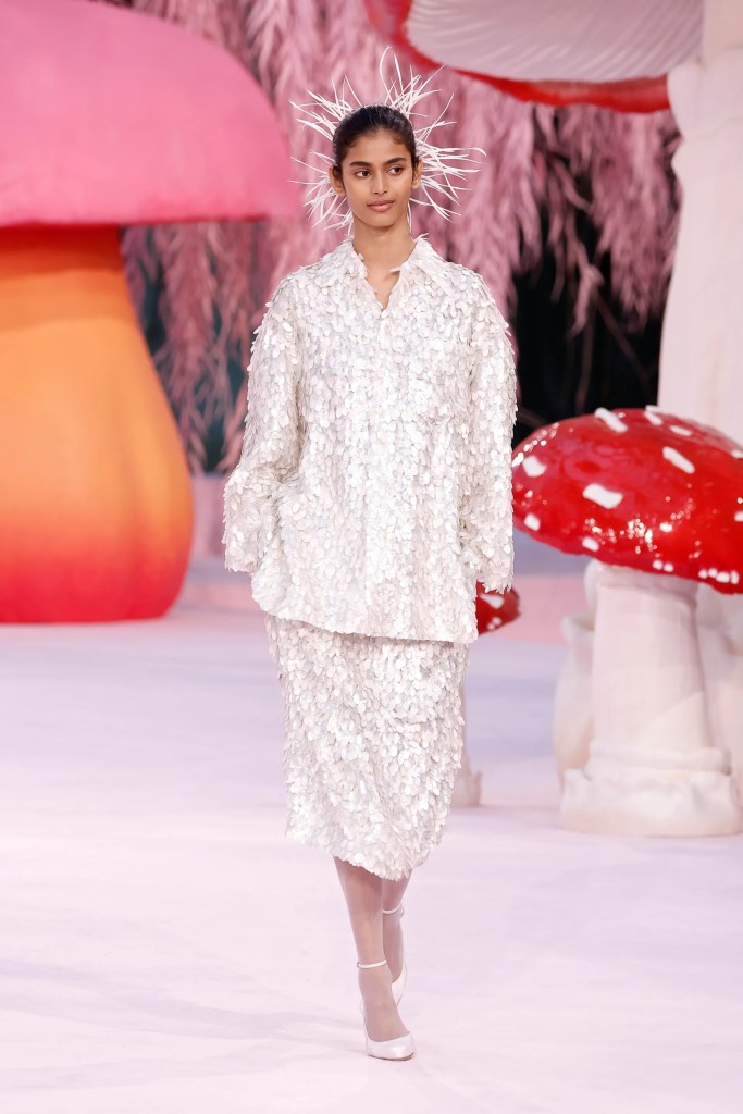 Enfin, Chanel a plongé le public dans une véritable forêt enchantée pour le premier défilé haute couture de Matthieu Blazy. Le Grand Palais a été métamorphosé en clairière féerique, peuplée de saules, d’oiseaux et de champignons géants aux couleurs vibrantes, oscillant entre rose pâle, rouge flamboyant, jaune solaire et fuchsia profond.