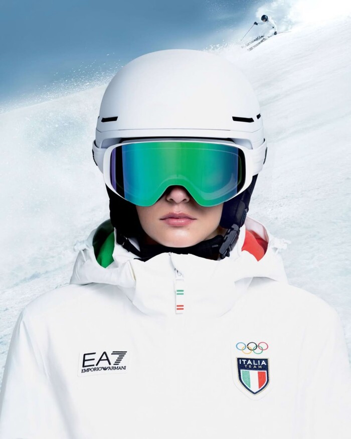 Du côté de l’Italie, le choix d’Emporio Armani s’inscrit dans une continuité presque naturelle. Fidèle partenaire du comité olympique italien depuis plusieurs éditions, la maison poursuit son dialogue entre élégance et fonctionnalité avec des silhouettes dominées par le blanc, volontairement épurées, presque immaculées. Ce minimalisme apparent est subtilement ponctué de détails rappelant le drapeau italien, notamment à l’intérieur des capuches des blousons, où apparaissent des touches de vert, de blanc et de rouge. Une manière discrète mais raffinée d’ancrer ces silhouettes dans une identité nationale forte, tout en conservant cette sobriété typiquement armanienne, où la coupe et la matière priment sur l’effet.