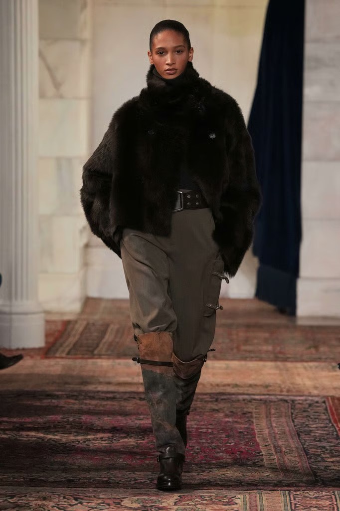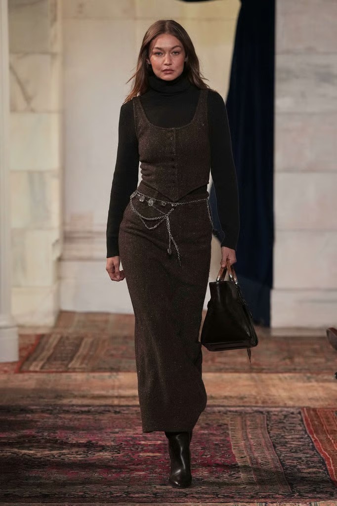 Sur le podium, ouvert par Gigi Hadid, les silhouettes féminines jouaient avec les contrastes. Les robes de soirée semblaient inspirées de l’âge d’or hollywoodien, drapées, satinées, parfois brodées, mais portées avec une nonchalance moderne. Les épaules sont marquées, les tailles soulignées, les longues capes et manteaux enveloppent les corps comme des armures élégantes. À l’inverse, certaines tenues s’autorisent une allure plus brute : cuir, bottes hautes, pantalons ajustés, chemises légèrement ouvertes. On sent une volonté d’incarner une femme Ralph Lauren moins sage, plus instinctive (et on adore ça).