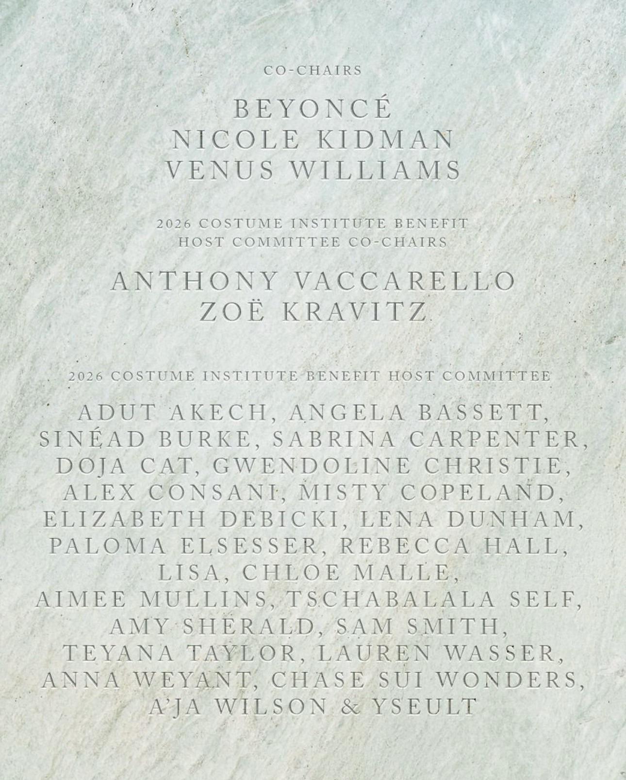 Côté casting, la soirée s’annonce tout aussi puissante. Les co-chairs de cette édition réunissent Beyoncé, Nicole Kidman, Venus Williams et l’incontournable Anna Wintour. Le Host Committee comptera notamment sur Sabrina Carpenter, Doja Cat, Alex Consani, Lena Dunham ou encore Misty Copeland : de quoi garantir des interprétations très personnelles du thème.