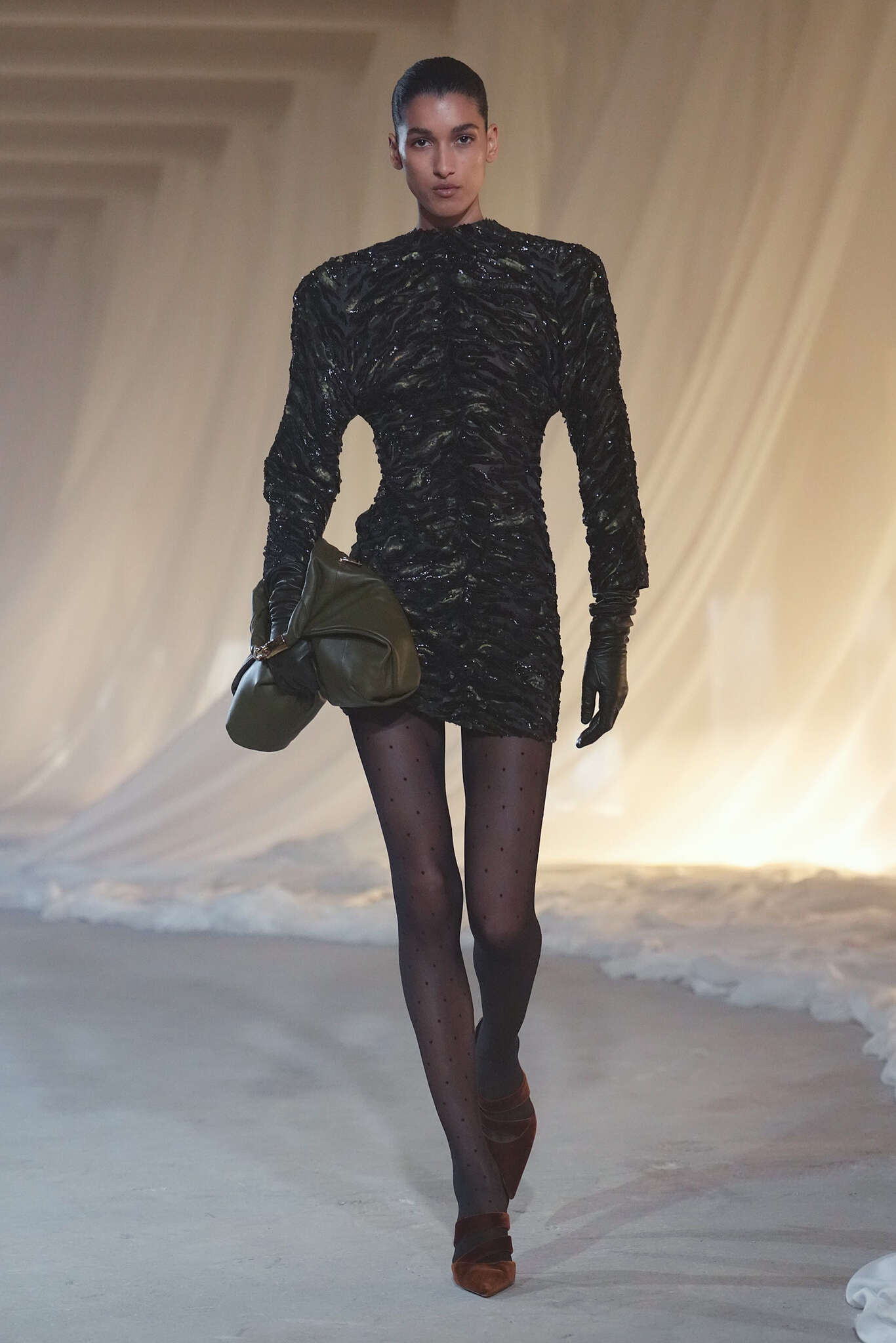 Certaines matières témoignent également d’un véritable travail couture. Les tissus riches et brillants, parfois ornés de motifs élaborés, évoquent l’amour du fondateur pour les textiles précieux. Parmi les détails marquants, on remarque notamment le retour de l’imprimé léopard introduit par la maison en 1953. Dans cette collection, il apparaît sur une mini-robe dont l’ourlet effiloché crée une transition subtile entre sophistication et modernité.