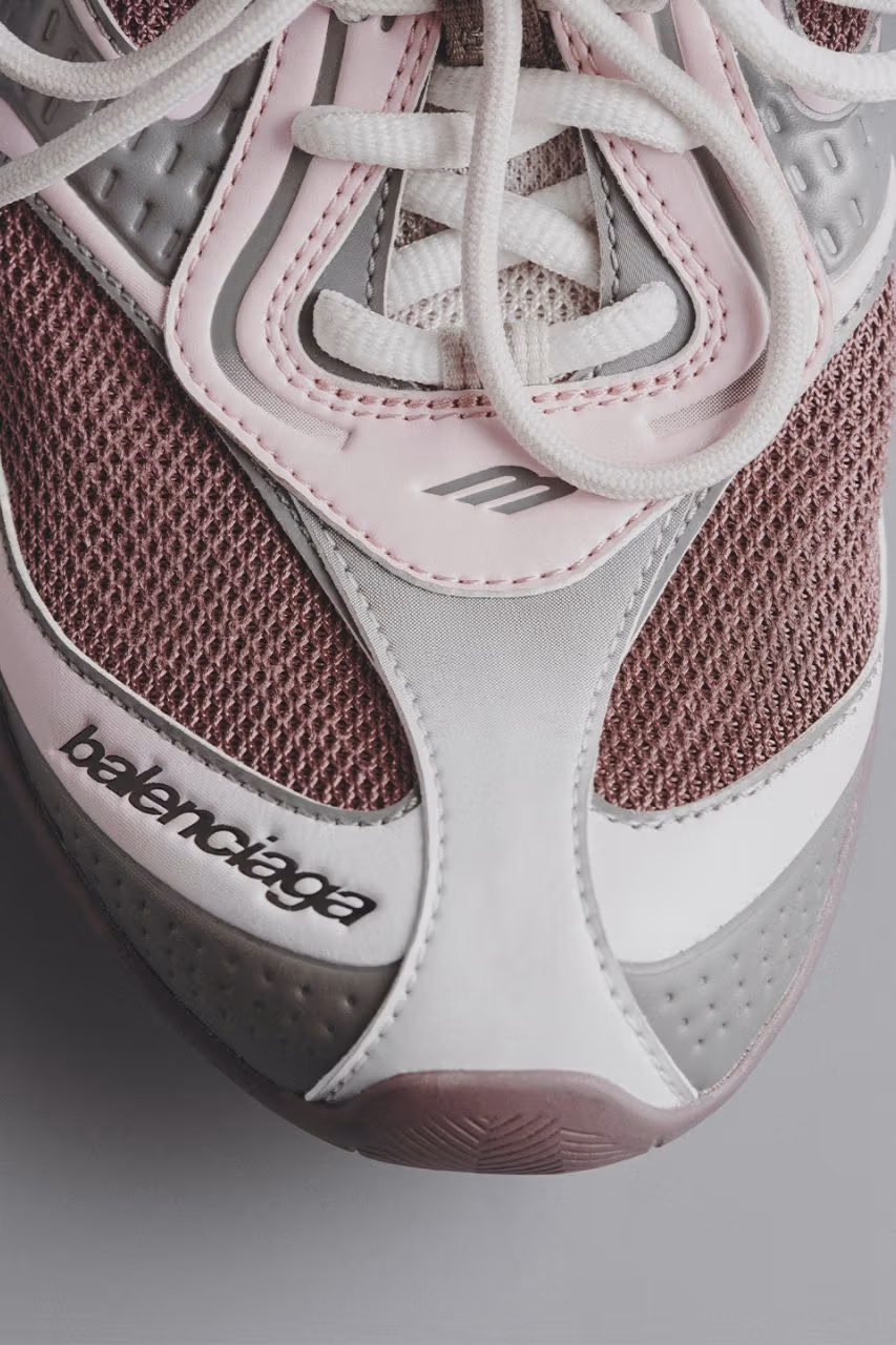 La chaussure est proposée dans plusieurs coloris, allant de palettes monochromes très sobres à des teintes plus affirmées comme des nuances de rose. Les détails graphiques restent fidèles au langage Balenciaga, avec notamment le logo sportif “3B” et la taille de la chaussure inscrite directement sur la structure.