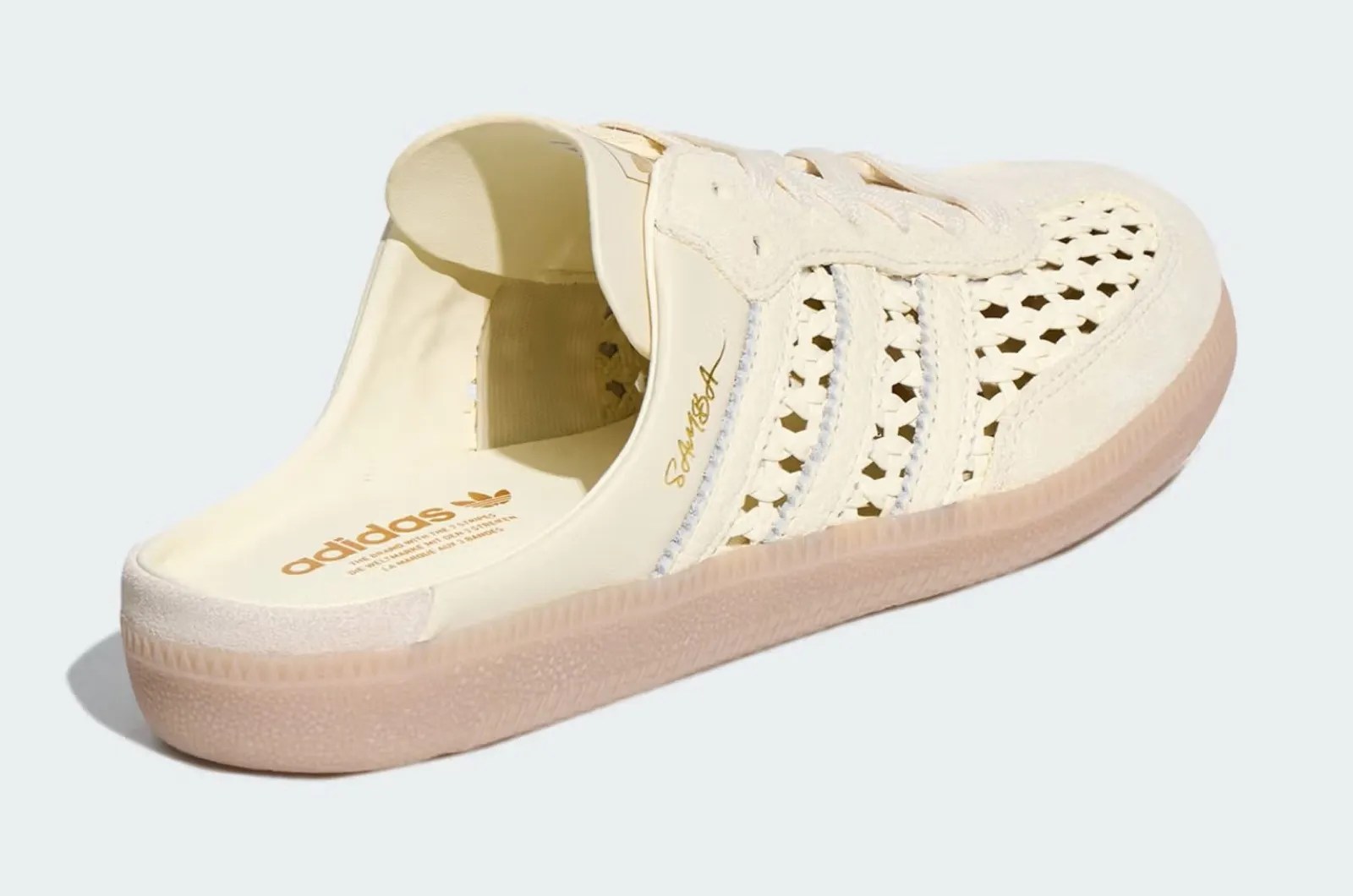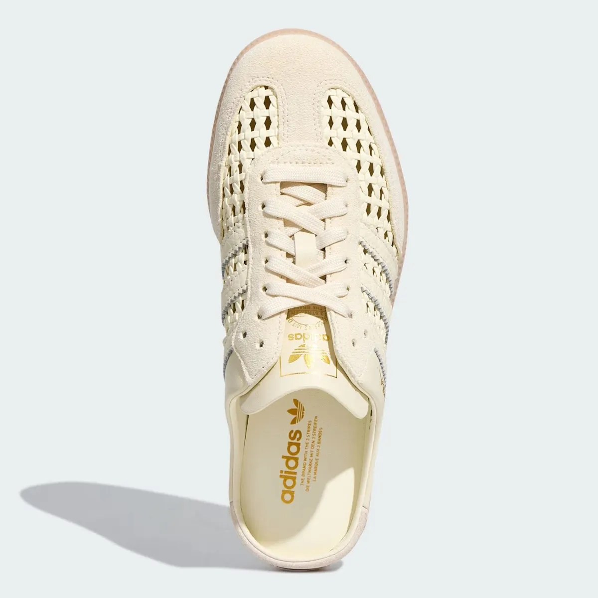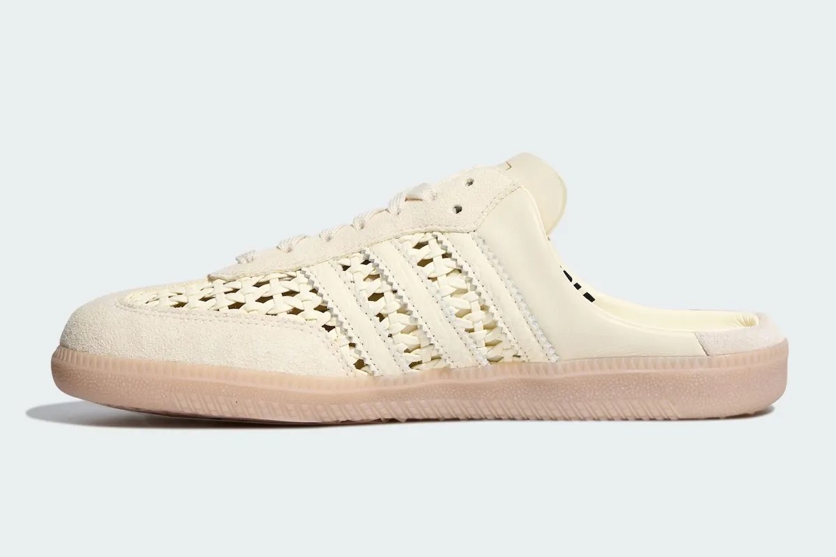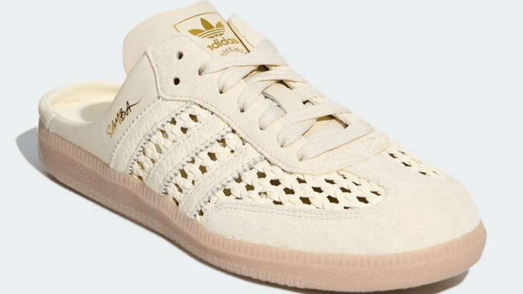 Cette nouvelle version, baptisée Samba Woven Mule, pousse même l’idée plus loin avec une construction revisitée. Le cuir classique laisse place à une matière tressée, plus respirante, pensée pour l’été. Le rendu est plus léger, plus texturé, presque artisanal.