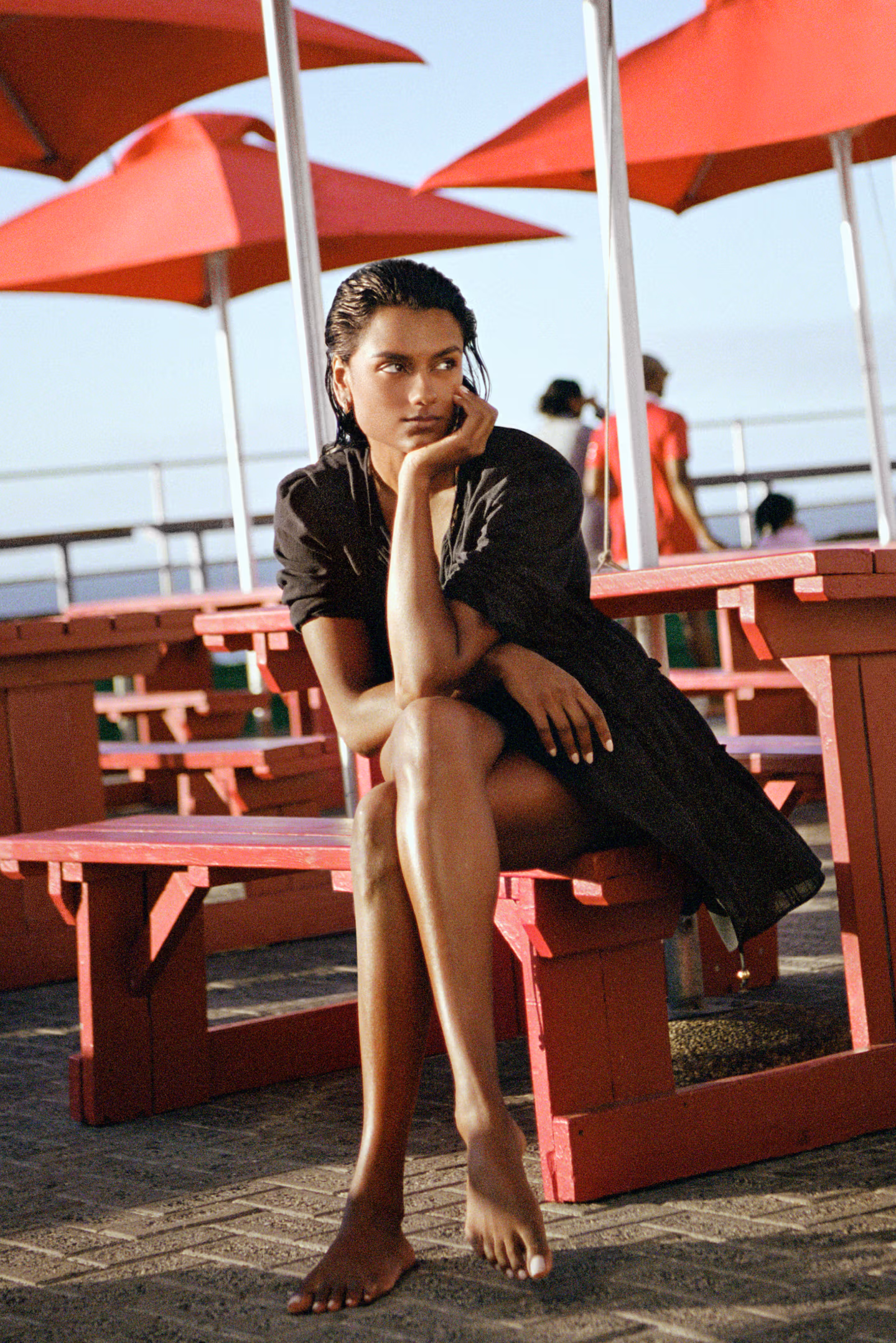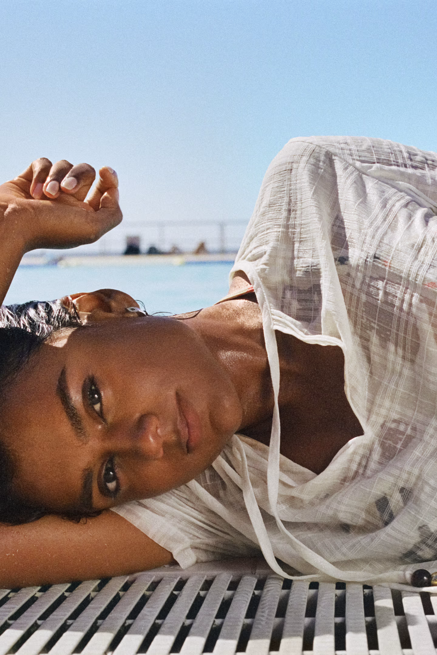 Visuellement, tout repose sur la lumière. Une lumière naturelle, presque brute, qui vient frapper les corps, les matières, les couleurs. Simone Ashley apparaît en maillot de bain, silhouettes épurées, gestes simples, regard ailleurs. Rien de surjoué. Tout semble spontané, comme saisi sur le vif.