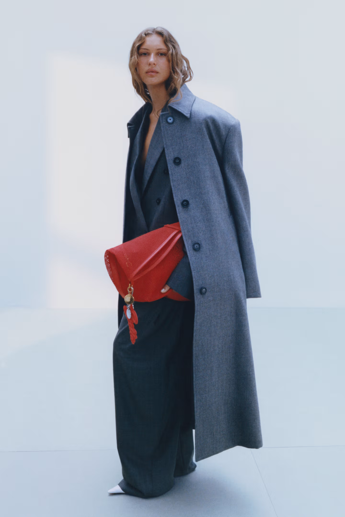 La collection revisite ses pièces iconiques. Tailoring structuré, trench coats en coton biologique, jeans ornés de cristaux, robes de soirée, mais aussi accessoires signatures comme le sac Falabella, ici réinterprété en version plus accessible, autour de 189,99£.